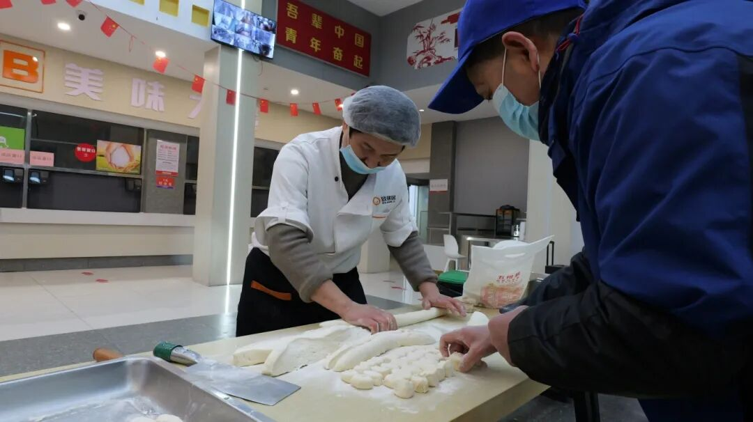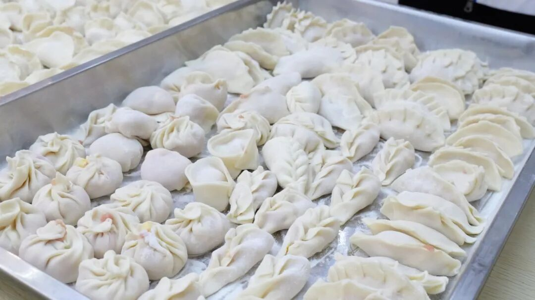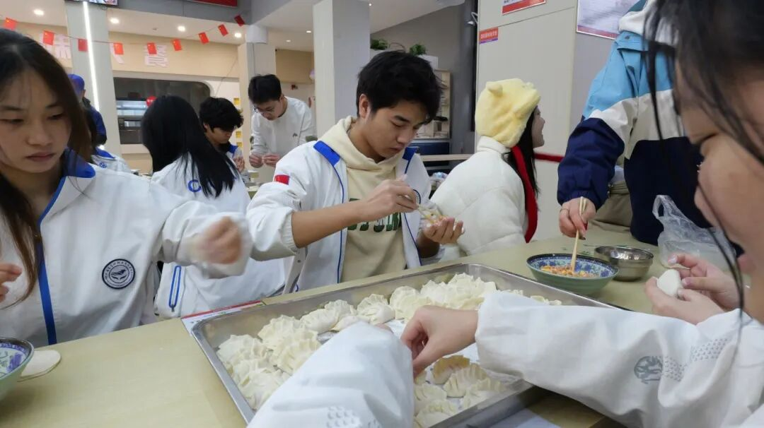 食堂里,师生围坐案前,揉面、擀皮、包馅,分工协作,有条不紊。指尖翻飞间,一个个形态各异的饺子应运而生,有的饱满圆润,有的精巧别致,每一个饺子都包裹着师生的情谊,承载着对新年的祈愿。